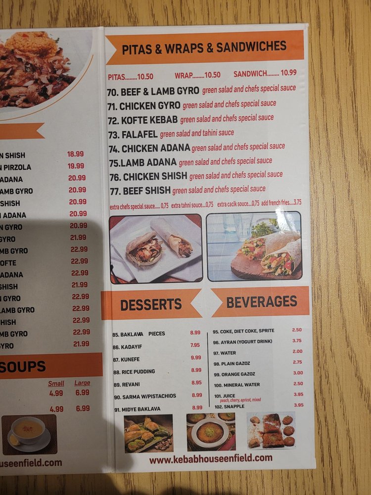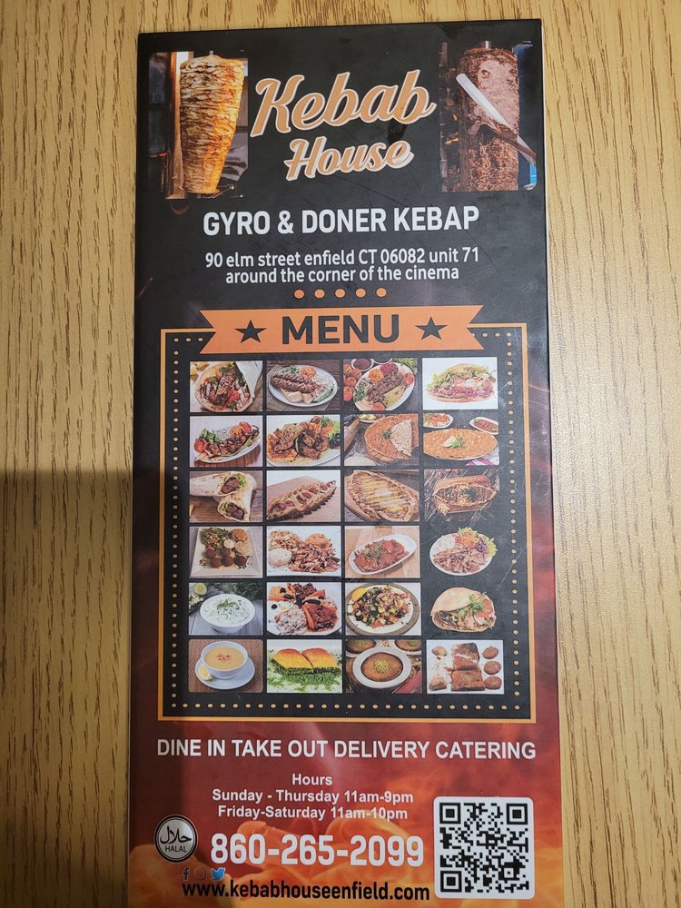 Introducing the menu at Kebab House, located at 90 Elm St Unit 71 Enfield, CT 06082. This classy establishment offers a variety of appetizers like Antep Ezme and Baba Ganoush, as well as delicious salads such as Arugula Salad and Fattoush Salad. The menu also features a selection of Pitas, Wraps, and Sandwiches, including Beef & Lamb Gyro and Chicken Shish. Customers have raved about the flavorful dishes like the Mixed Grill, lamb shish, and falafel. The restaurant's beautiful decor and cultural ambiance create a unique dining experience, with the option to dine in the Mosiac room. Overall, Kebab House offers tasty and filling meals, friendly service, and a welcoming atmosphere for guests to enjoy authentic Mediterranean cuisine.